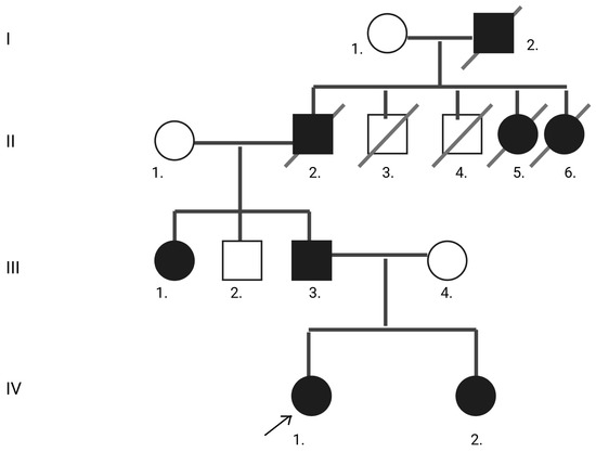 Pedigree tree of the affected sisters. The proband is indicated with an arrow. Distant relatives marked as affected are based on family history only.
