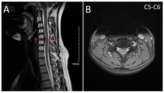 Magnetic Resonance Imaging (MRI) of the cervical spine. (A) T2-weighted sagittal spine magnetic resonance imaging (MRI) demonstrating a C5–C6 intervertebral disc herniation with compression of the dural sac but no signal changes suggestive of myelopathy. The horizontal reference line indicates the axial level shown in (B). (B) T2-weighted axial spine MRI at C5–C6 confirming the disc herniation with dural sac compression, without evidence of myelopathic changes.