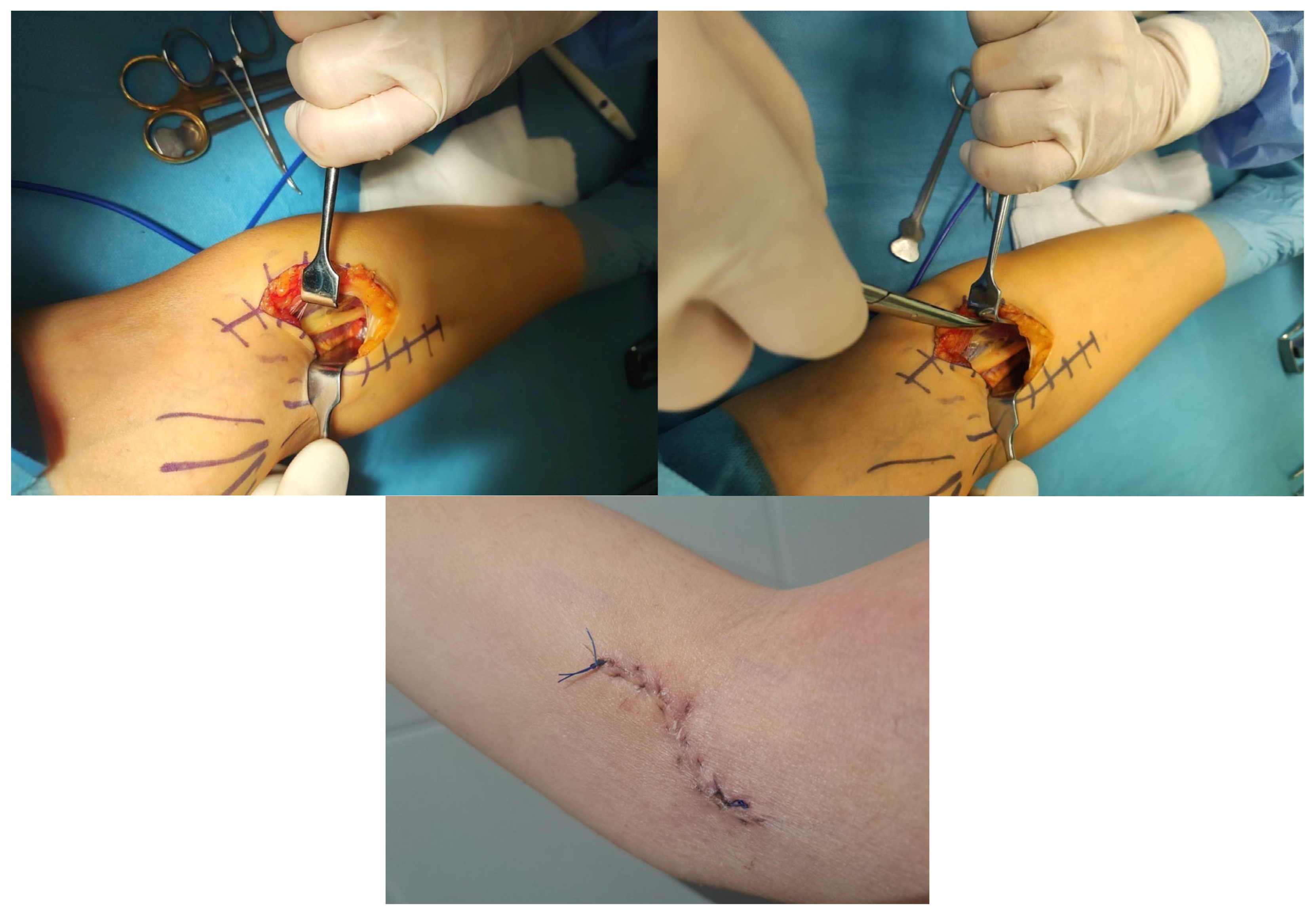 - Binder, H.; Zadra, A.; Popp, D.; Komjati, M.; Tiefenboeck, T.M. Outcome of Surgical Treated Isolated Pronator Teres Syndromes-A Retrospective Cohort Study and Complete Review of the Literature. Int. J. Env. Res. Public. Health. 2021, 19, 80. [Google Scholar] [CrossRef]