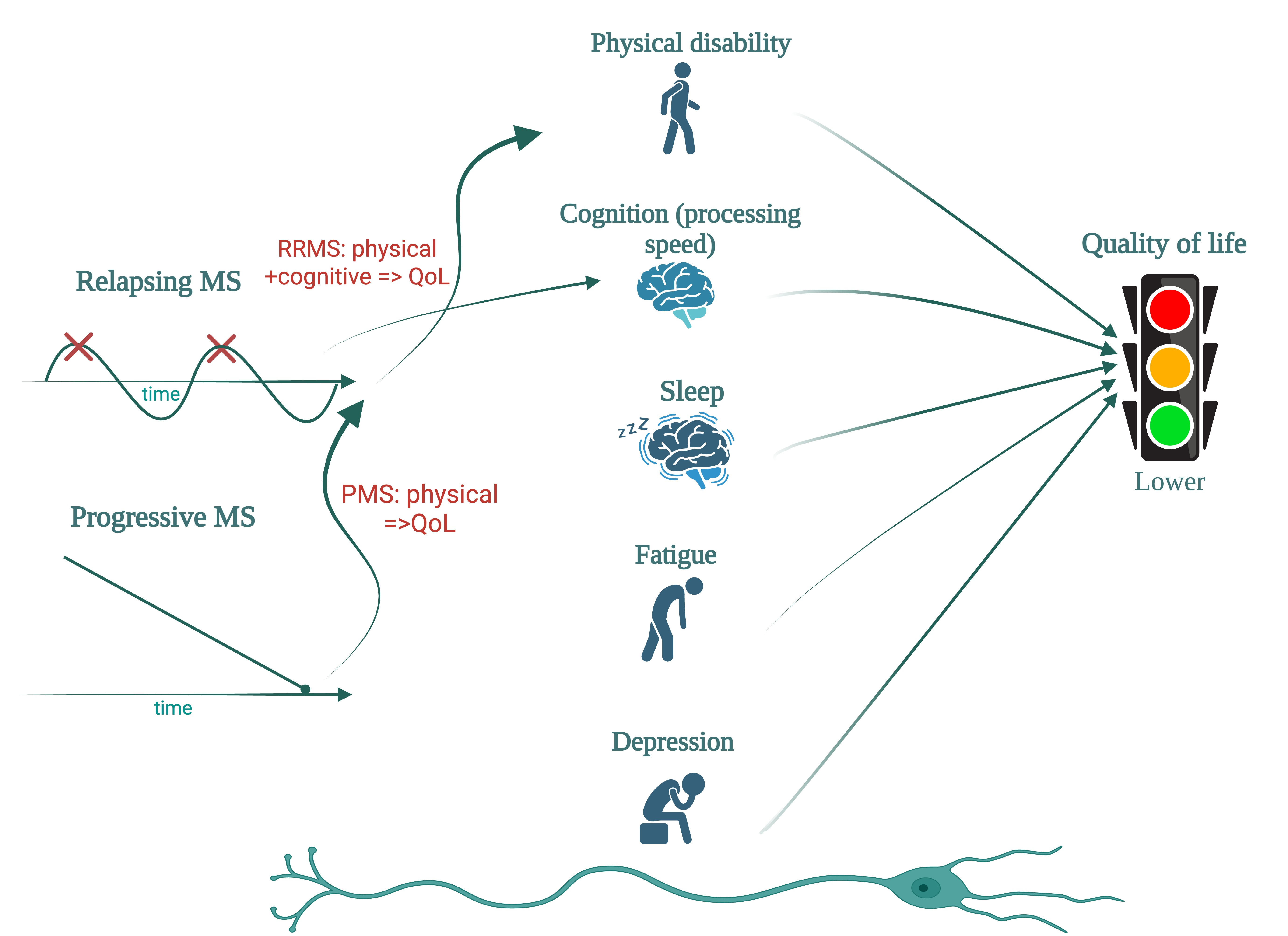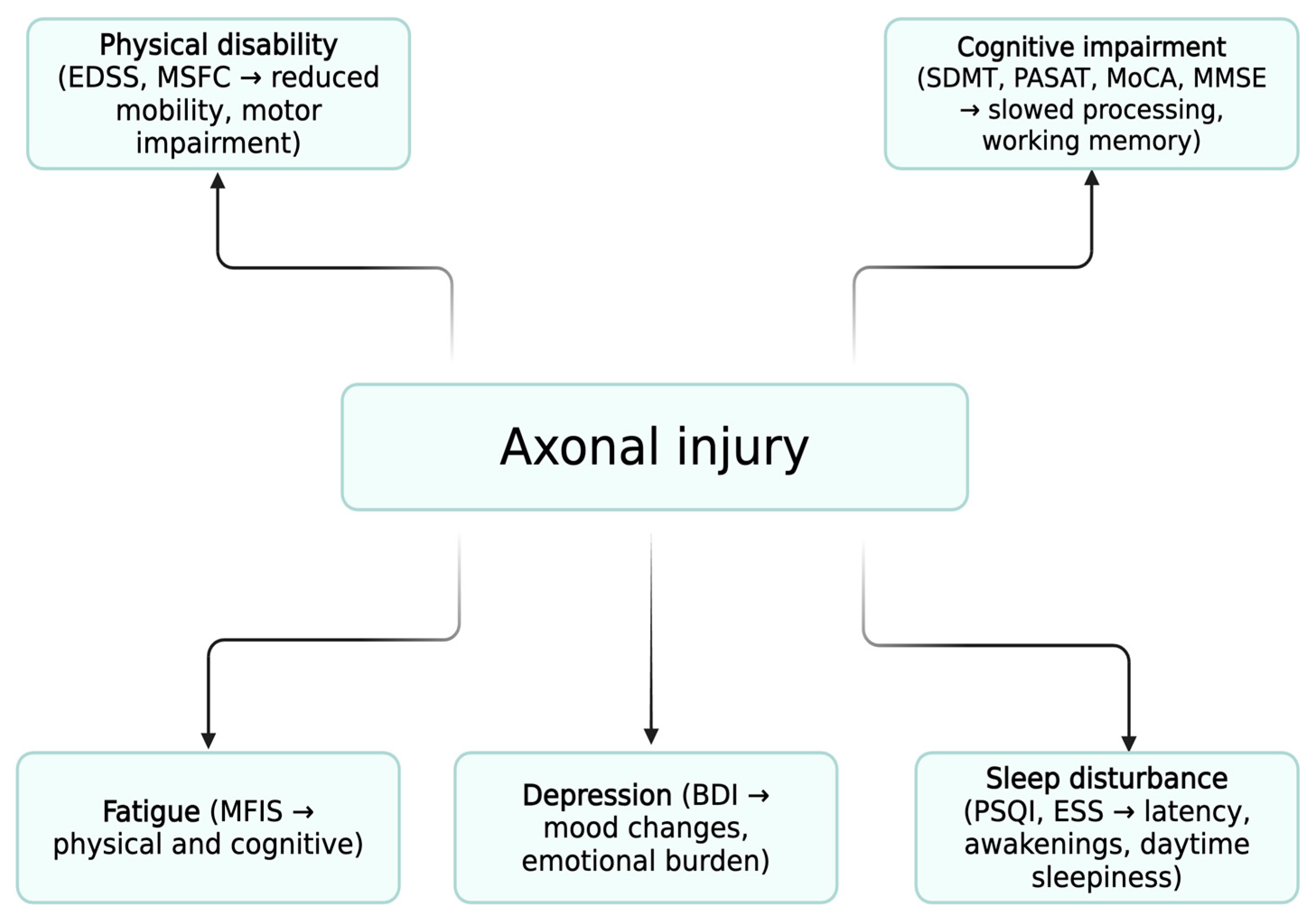 Multidimensional Impairment in Multiple Sclerosis: Physical Disability, Cognitive Dysfunction, Sleep Disturbance, Fatigue, Depression, and Their Impact on Quality of Life—A Possible Common Pathological Pathway