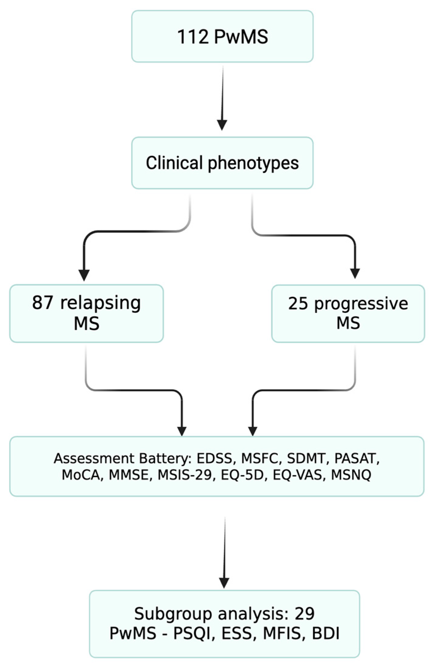 - Moradi, A.; Ebrahimian, A.; Sadigh-Eteghad, S.; Talebi, M.; Naseri, A. Sleep quality in multiple sclerosis: A systematic review and meta-analysis based on Pittsburgh Sleep Quality Index. Mult. Scler. Relat. Disord. 2025, 93, 106219. [Google Scholar] [CrossRef]