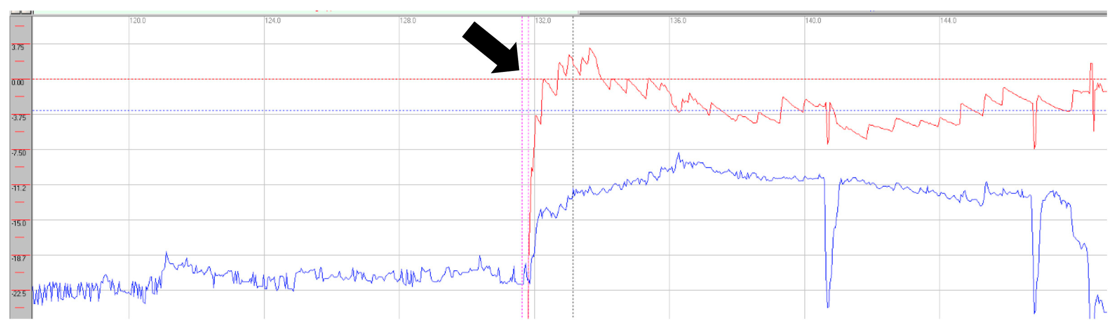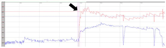 Videonystagmography during rightward gaze showing gaze-evoked right-beating horizontal nystagmus (black arrow). Red line: horizontal eye movements; blue line: vertical eye movements.