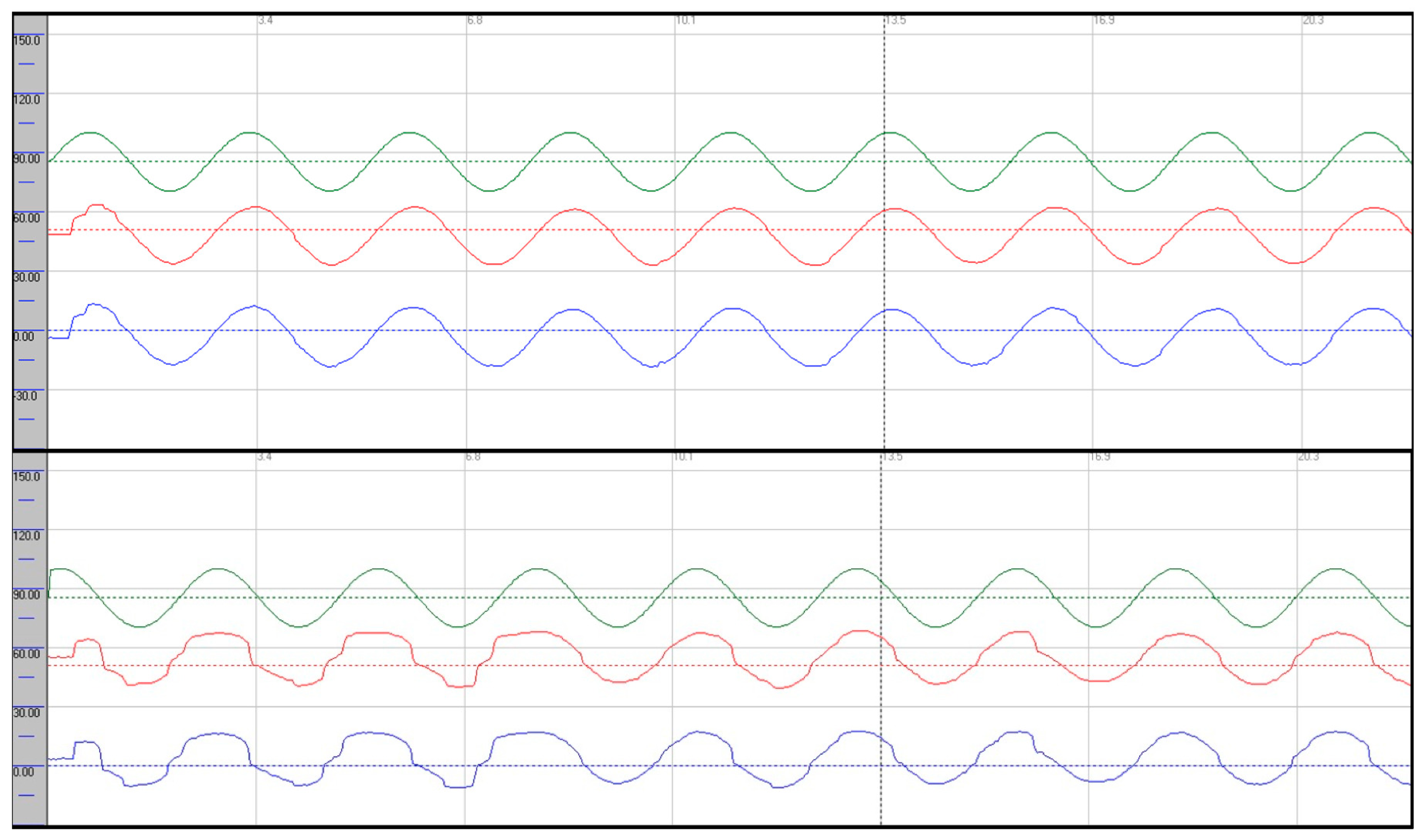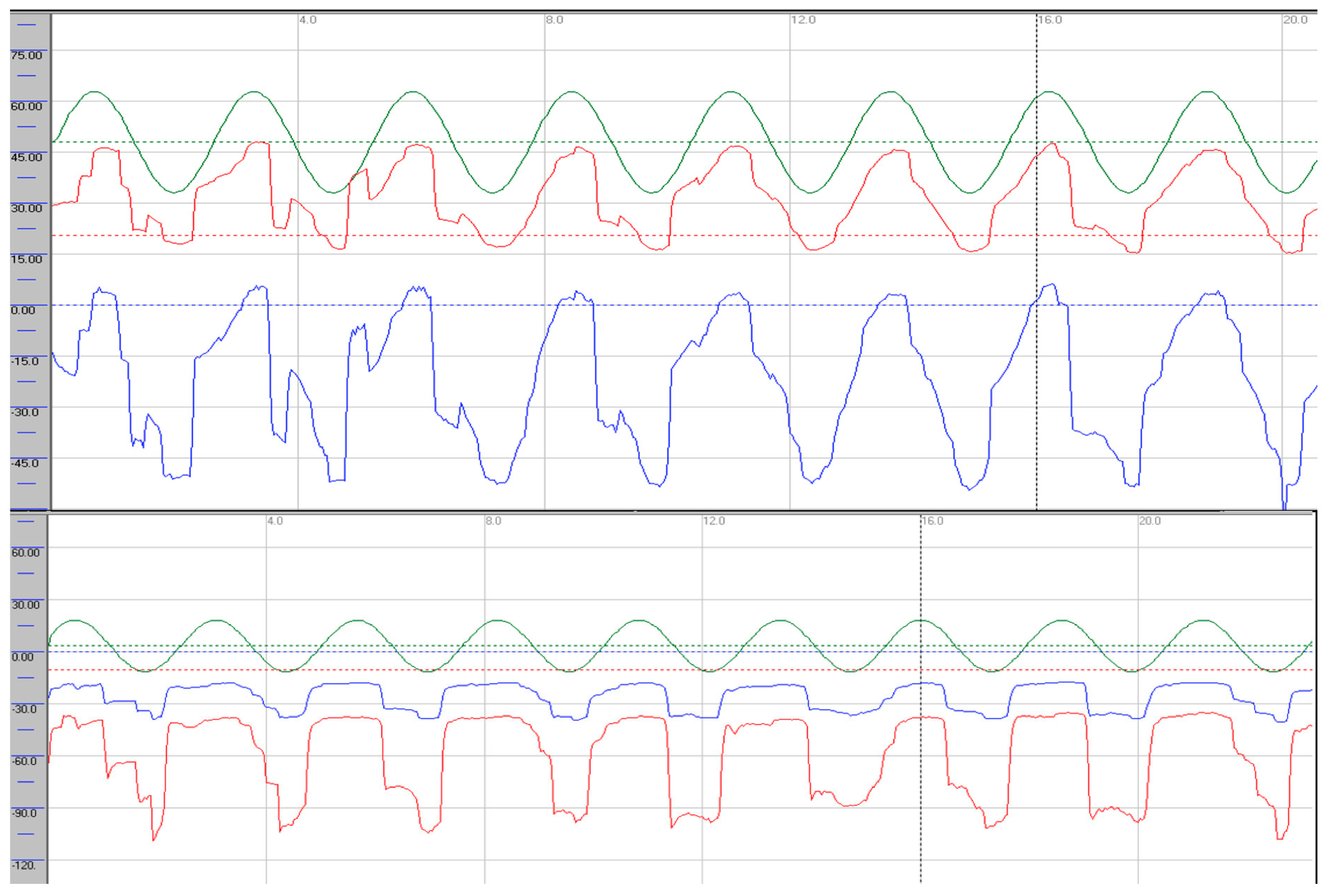 Smooth pursuit recordings in the horizontal (upper trace) and vertical (lower trace) planes, demonstrating severe pursuit deficits. Stimulation parameters: amplitude 30°, frequency 0.4 Hz. Average gains—horizontal: right eye 0.52 (rightward), 0.41 (leftward); left eye 0.52 (rightward), 0.41 (leftward). Vertical: right eye 0.48 (upward), 0.36 (downward); left eye 0.48 (upward), 0.36 (downward). Green: target; red: right eye; blue: left eye.