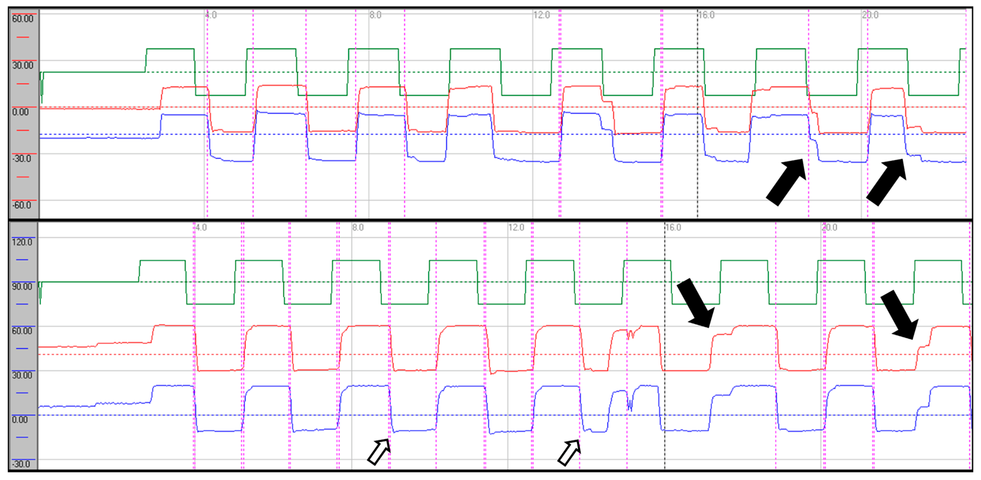 Saccadic recordings in the horizontal (upper trace) and vertical (lower trace) planes. Repetitive stimulation revealed horizontal hypometria (greater to the left) and upward hypometria (black arrows). Downward saccades show slight hypermetria (black hollow arrows). Stimulation parameters: amplitude 30°, frequency 0.4 Hz. Green: target; red: right eye; blue: left eye.