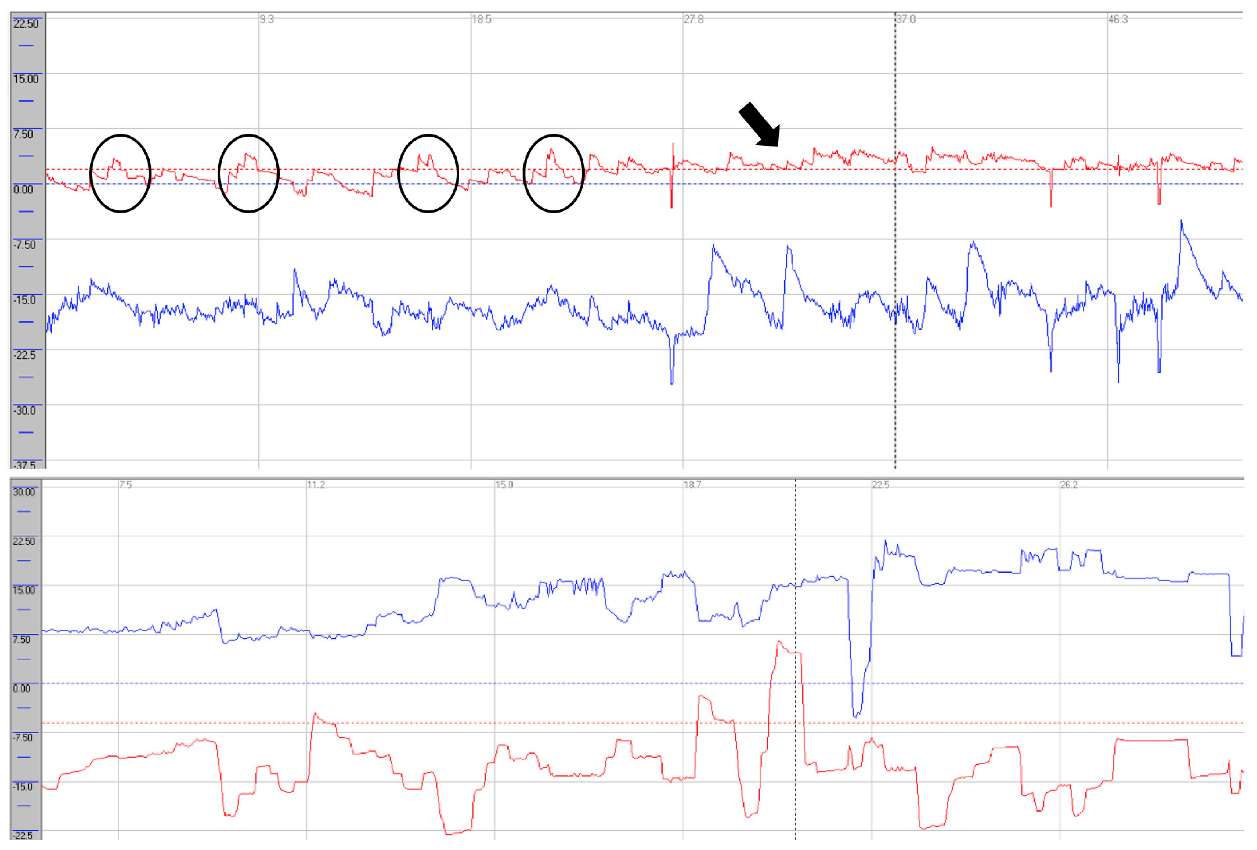 Videonystagmography during primary gaze. Horizontal traces (red) show paroxysmal saccadic intrusions (black circles) with superimposed right-beating nystagmus (black arrows). Vertical traces (blue) demonstrate continuous, arrhythmic saccadic intrusions (upper trace); square-wave jerks were also present (lower trace). Red line: horizontal eye movements; blue line: vertical eye movements.