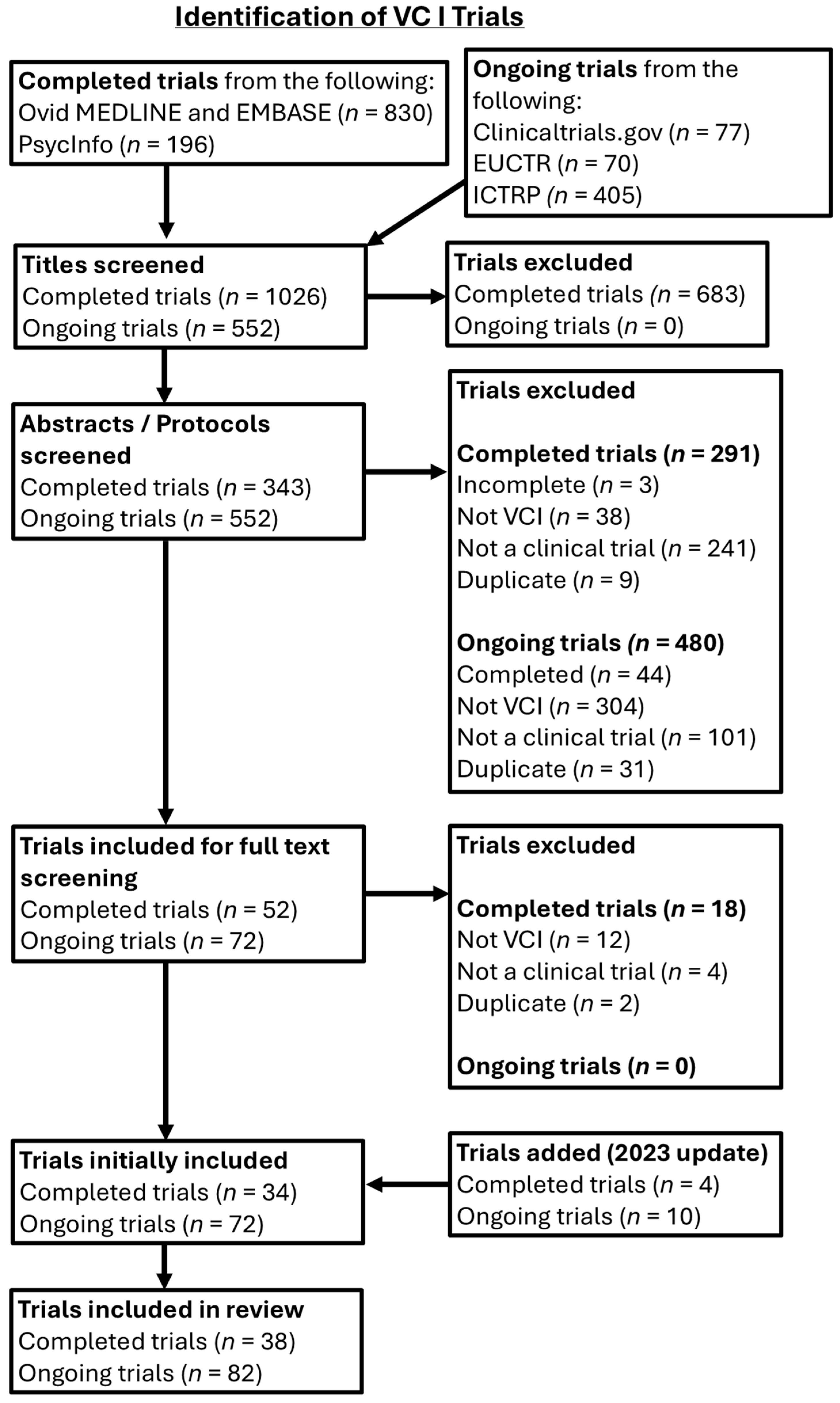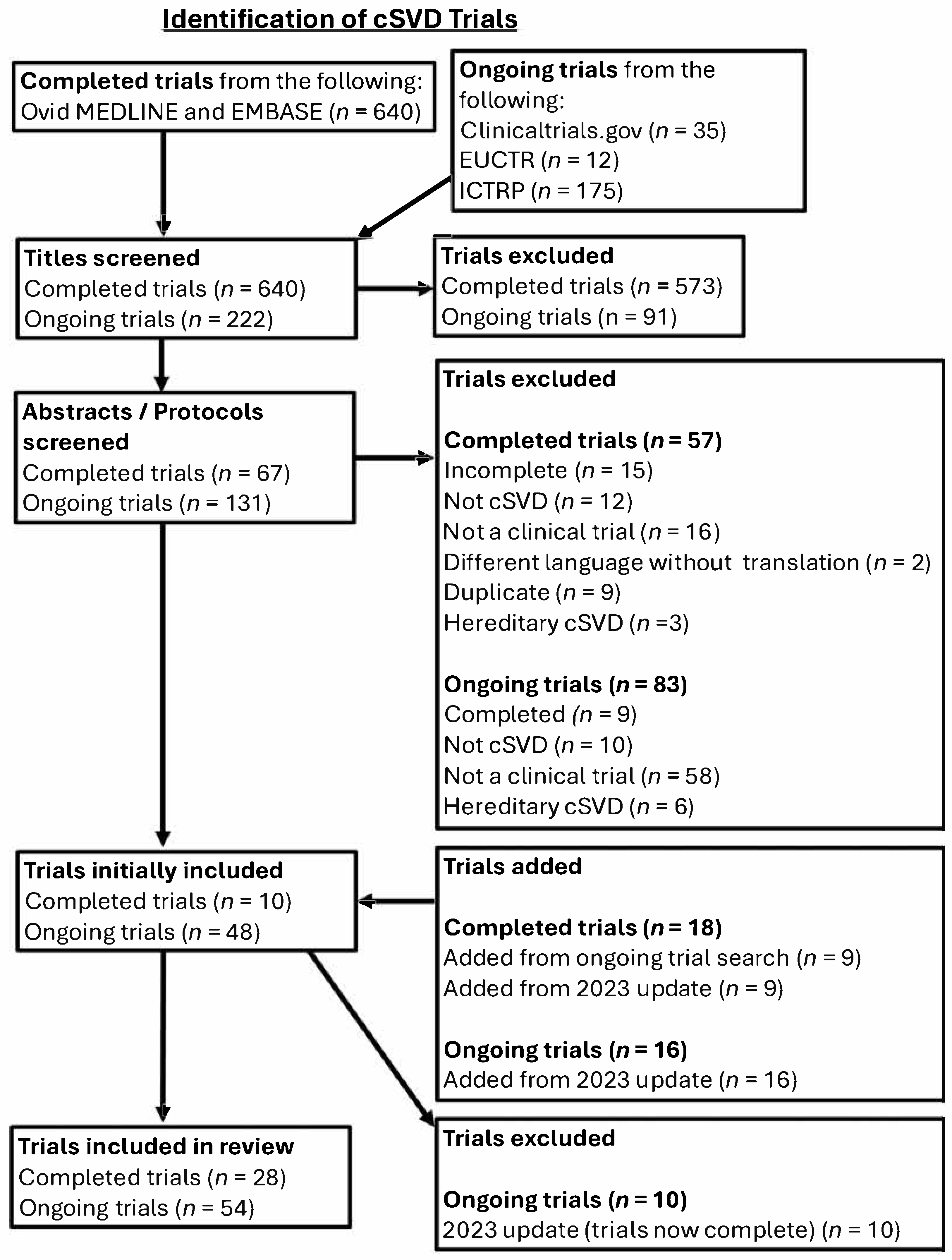 Both randomied and non-randomised clinical trials were included, provided they were studies of an intervention. To offer a representation of contemporary trial activity, we included both recently completed and ongoing studies. Completed trials with published full-text papers were included based on literature searching. For ongoing trials, trials at any stage of recruitment status, or complete trials with unpublished results, were included. Non-interventional designs, such as observational studies, systematic reviews, and test accuracy studies, were excluded. Conference abstracts were excluded. Secondary and subgroup analyses of larger trials were excluded if the primary focus of the parent trial was not cSVD/VCI. Duplicate titles were excluded; if a trial was described in more than one paper, the paper with the most detailed description was included. No language restrictions were enforced, but foreign language papers where we did not have access to a suitable translator or equivalent English text were not included in the final analysis.