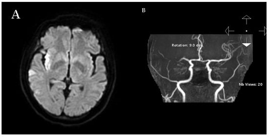 (A) Axial diffusion-weighted MRI showing cortical and subcortical hyperintensity in the right MCA territory, consistent with acute infarction. (B) Time-of-Flight Magnetic Resonance Angiography (TOF-MRA) showing occlusion of the right middle cerebral artery.