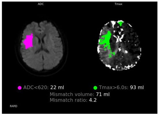 RAPID MRI demonstrating a perfusion–diffusion mismatch, with a core infarct volume of 22 mL (apparent diffusion coefficient < 620 × 10−6 mm2/s) and a hypoperfused region of 93 mL (Tmax > 6.0 s), yielding a mismatch ratio of 4.2 and a salvageable penumbra of 71 mL.