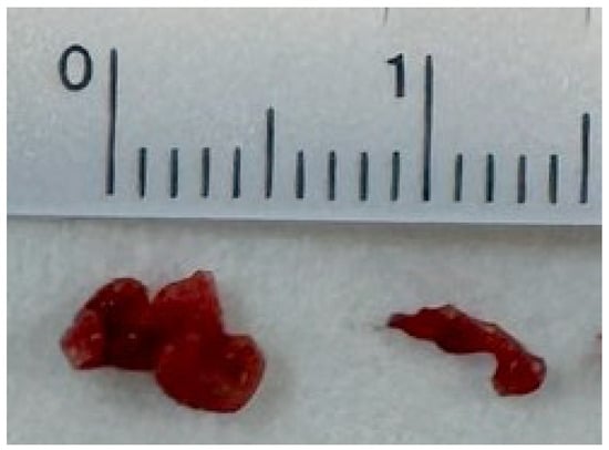Post-recanalization angiography revealed a previously unrecognized 7.2 mm MCA bifurcation aneurysm with a 4.7 mm neck (Figure 3B). Three-dimensional rotational angiography confirmed a broad-neck bifurcation aneurysm (Figure 3C). During EVT, systolic BP was maintained at 120–140 mmHg to minimize rupture risk, with only minimal heparinization to maintain catheter patency. After confirming no hemorrhage on follow-up imaging, dabigatran was resumed on day 4. The patient was discharged on day 11 (NIHSS 1). One month later, she underwent stent-assisted coil embolization, achieving complete aneurysm obliteration with preserved MCA branch patency (Figure 3D). She remained asymptomatic with full neurological recovery at three-month follow-up. Retrieved thrombi were dark red with central pale foci, consistent with fibrin-rich cardioembolic composition (Figure 4).