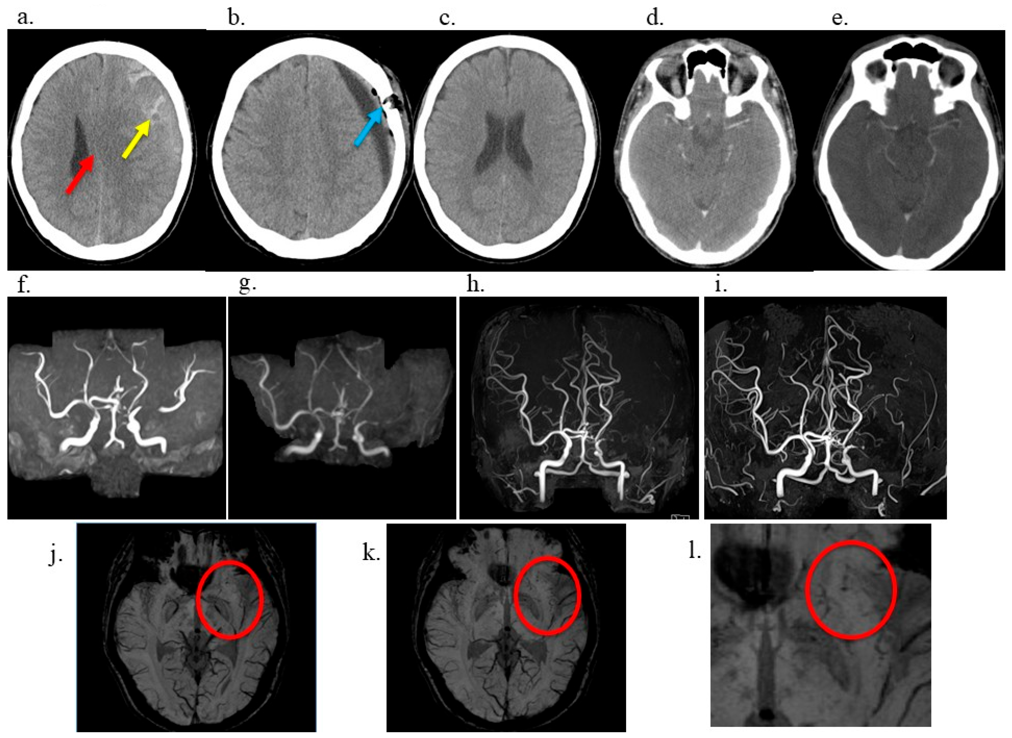 - Zaletel, M.; Surlan-Popović, K.; Pretnar-Oblak, J.; Zvan, B. Moyamoya syndrome with arteriovenous dural fistula after head trauma. Acta Clin. Croat. 2011, 50, 115–120. [Google Scholar]