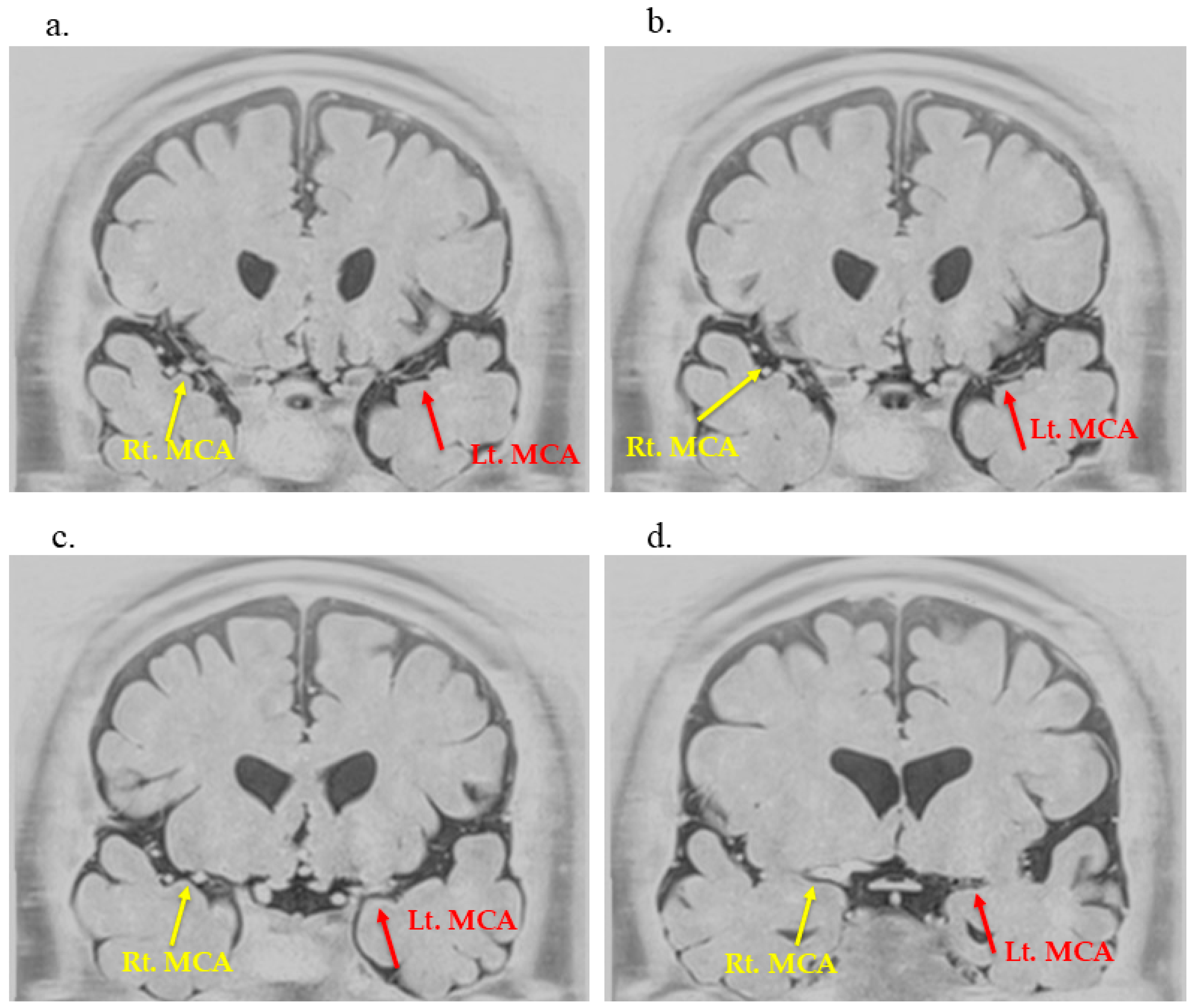 - Liu, C.-C.; Yang, Y.; Dong, J.; Sun, Z.-Q.; Ran, Q.-S.; Li, W.; Jin, W.-S.; Zhang, M. MCA Parallel Anatomic Scanning MR Imaging-Guided Recanalization of a Chronic Occluded MCA by Endovascular Treatment. Am. J. Neuroradiol. 2024, 45, 1227–1229. [Google Scholar] [CrossRef]