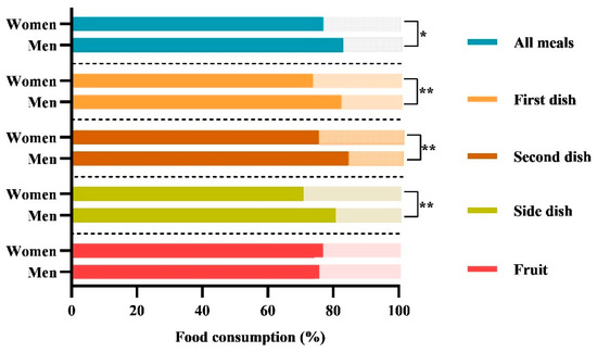 Comparison of food consumption between women and men. The histograms show the percentages of the daily average food consumption of women and men during the six weeks of treatment. The following nomenclature is employed for the consumption of meals served in accordance with Italian customs: (i) the totality of “all meals”; (ii) the “first dish” (lunch + dinner) consists of carbohydrates (e.g., cereals such as pasta, rice, or semolina), which are typically seasoned with vegetables or legumes or both; (iii) the “second dish” (lunch + dinner) consists of a protein source (meat, fish, eggs, or dairy products); (iv) the ‘side dish’ (lunch + dinner), consists of a vegetable dish; (v) the “fruit”, consists of mousse or a seasonal fruit, such as an orange, a banana, or an apple. The data are reported as the mean percentage (%). The p-value refers to the Mann–Whitney test; * p-value < 0.05; ** p-value < 0.01.