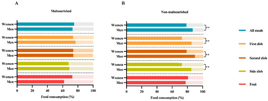Food consumption differences between women and men in malnourished (A) and non-malnourished patients (B). The histograms show the differences in food consumption of meals served according to Italian customs between the two genders by dividing the subjects by malnutrition (“malnourished” and “non-malnourished”), according to GLIM criteria. The following nomenclature is employed for the consumption of meals served in accordance with Italian customs: (i) the totality of “all meals”; (ii) the “first dish” (lunch + dinner) consists of carbohydrates (e.g., cereals such as pasta, rice, or semolina), which are typically seasoned with vegetables or legumes or both; (iii) the “second dish” (lunch + dinner) consists of a protein source (meat, fish, eggs, or dairy products); (iv) the ‘side dish’ (lunch + dinner) consists of a vegetable dish; (v) the “fruit” consists of mousse or a seasonal fruit, such as an orange, a banana, or an apple. The data are reported as the mean percentage (%). The p-value refers to the Mann–Whitney test; ** p-value < 0.01.