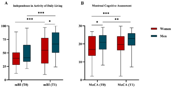 Figure 3 shows the mBI (A) and in MoCA (B) values at T0 and T1, disaggregated by gender. Women and men showed a significant improvement in mBI (41.2 ± 17.3 vs. 55.3 ± 26.1; p < 0.001 and 49.5 ± 20.8 vs. 67.1 ± 21.8; p < 0.001, respectively) and MoCA values (20.6 ± 5.1 vs. 22.0 ± 5.2; p = 0.001 and 17.4 ± 6.7 vs. 19.5 ± 6.4; p < 0.001, respectively). Comparing women and men at T0, the MoCA values were different (17.4 ± 6.7 vs. 20.6 ± 5.1; p = 0.024), while the mBI values were not (41.2 ± 17.3 vs. 49.2 ± 20.8; p = 0.144). On the other hand, at T1, women showed significantly lower mBI values than men (55.3 ± 26.1 vs. 67.1 ± 21.8; p = 0.032), while the MoCa values were similar (19.5 ± 6.4 vs. 21.9 ± 5.2; p = 0.060).