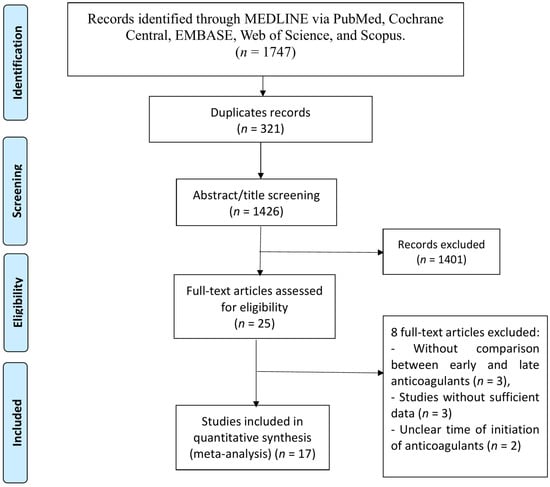 A total of 1426 unique records were identified from the database search. After screening titles and abstracts, 25 studies were selected for full-text evaluation to determine eligibility. Of these, 17 studies satisfied all inclusion criteria and were incorporated into the final meta-analysis. The overall selection process is summarized in the PRISMA flow diagram presented in Figure 1.