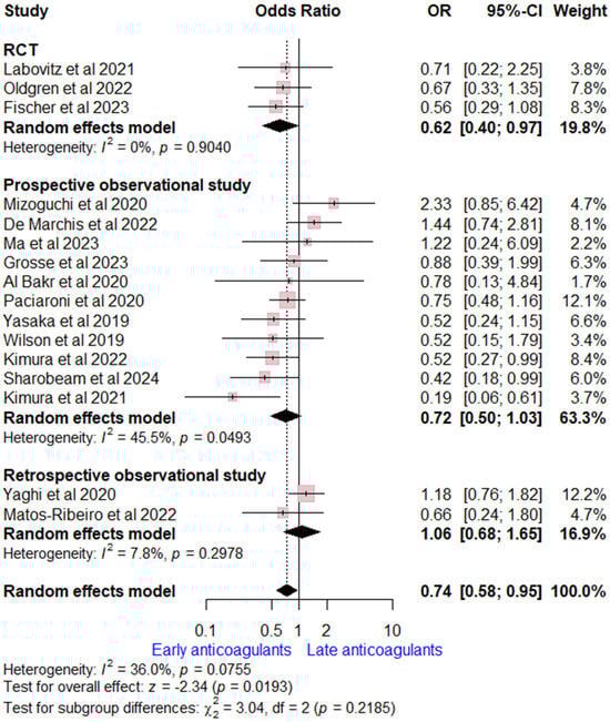 Data on ICH rates were extracted from 17 studies (three RCTs, 11 prospective, and three retrospective observational studies). The overall OR for early versus late OACs was (OR = 0.74, (95% CI [0.41, 1.33], p = 0.32), indicating no significant difference. Moderate heterogeneity was detected (I2 = 46%, p = 0.02). Subgroup analysis according to study design was consistent with the overall estimate (Figure 3).