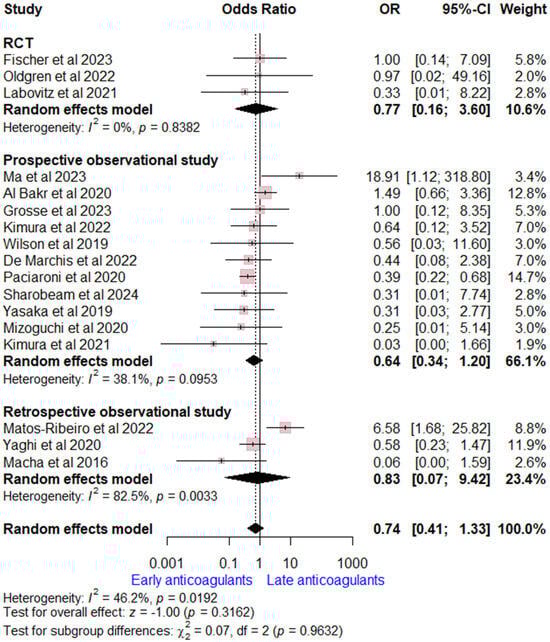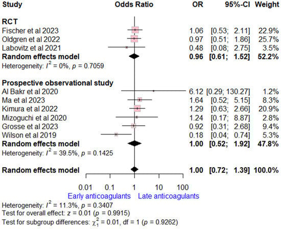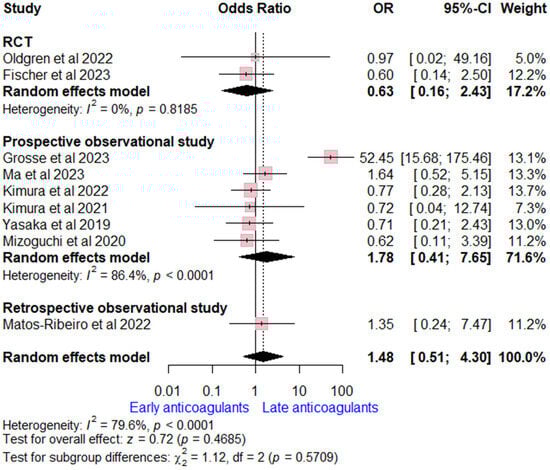 Data on major bleeding rates were extracted from nine studies (two RCTs, six prospective, and one retrospective observational study). The overall OR for early versus late OACs was (OR = 1.48, (95% CI [0.51, 4.30], p = 0.47), indicating no significant difference. High heterogeneity was detected (I2 = 80%, p < 0.002). Subgroup analysis according to study design was consistent with the overall estimate (Figure 4).