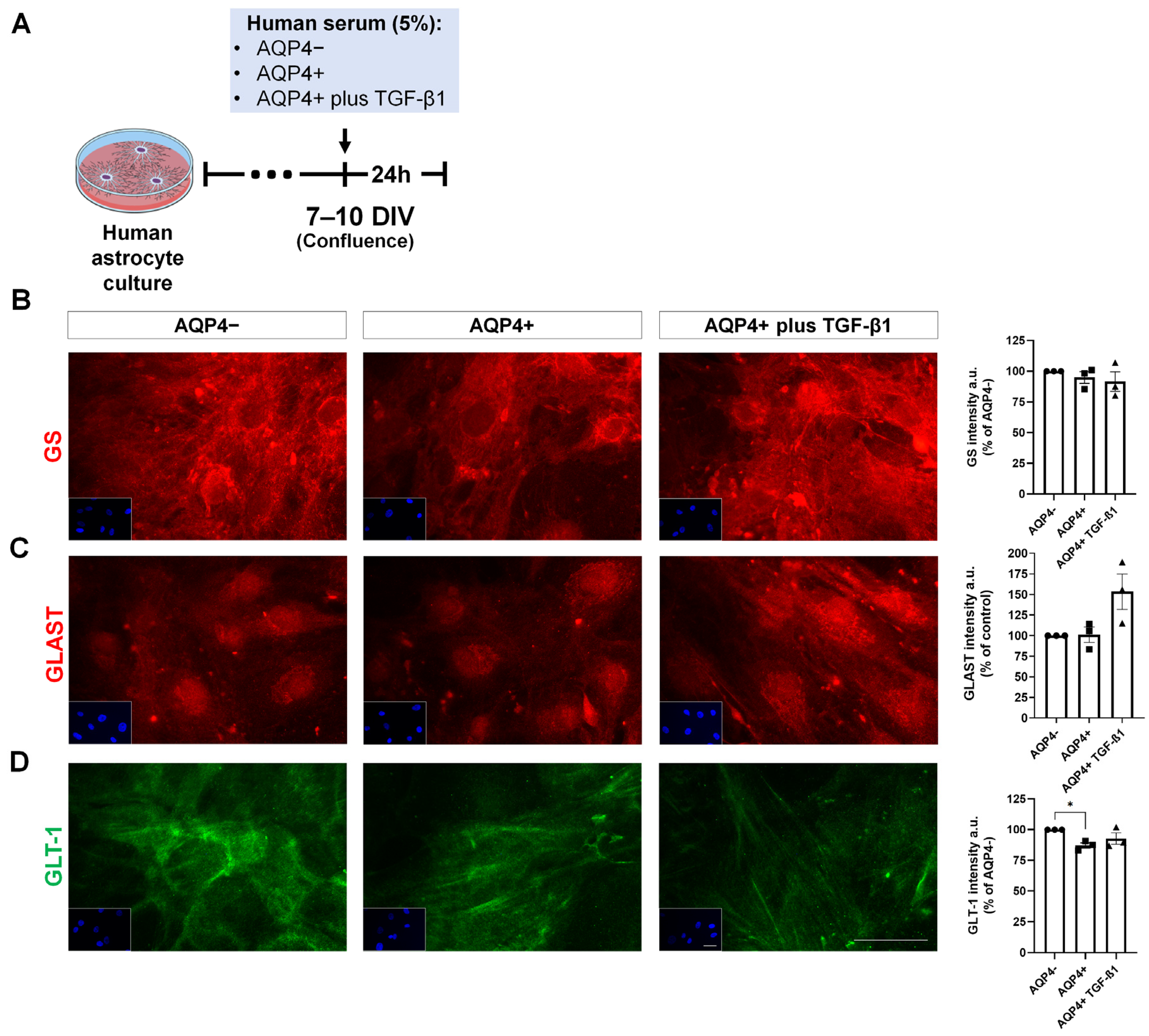 - Xue, X.; Zhang, W.; Zhu, J.; Chen, X.; Zhou, S.; Xu, Z.; Hu, G.; Su, C. Aquaporin-4 deficiency reduces TGF-β1 in mouse midbrains and exacerbates pathology in experimental Parkinson’s disease. J. Cell. Mol. Med. 2019, 23, 2568–2582. [Google Scholar] [CrossRef] [PubMed]