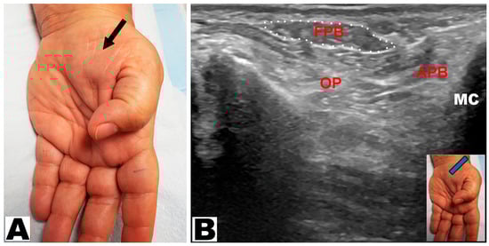 (A) Partial thenar atrophy with hypertrophy of the flexor pollicis brevis (FPB) muscle (oblique arrow). (B) Ultrasound study confirms partial thenar atrophy with a hypertrophic FPB muscle (encircled) and severe atrophy of the APB and OP muscles. The blue insert denotes the position of the ultrasound probe. APB: abductor pollicis brevis muscle. OP: opponens pollicis muscle. MC: metacarpal.