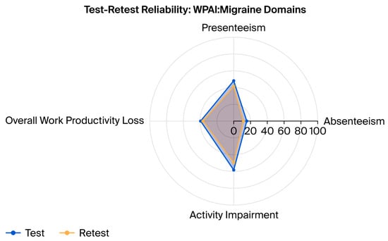 Of the 82 eligible migraine patients, 43 completed the second WPAI administration. Test–retest reliability was assessed using ICCs, which ranged from 0.68 for overall work productivity loss to 0.84 for presenteeism, indicating substantial-to-almost-perfect correlations across all domains (Table 2). A radar chart comparing the mean test and retest WPAI:Migraine domain scores showed similar trends across all domains, supporting the instrument’s test–retest reliability (Figure 1).