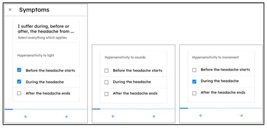 All study participants were interviewed during the intake visit of the study by a physician researcher and neurologist with expertise in the field of clinical headache disorders (N.V.). Together with the physician researcher, the participants went through a list of possible headache-associated symptoms and answered whether the symptom was present before, during, and/or after typical migraine headache events or not (multiple answers possible). This intake symptomatology list was represented by a questionnaire within the “mBrain” smartphone application (Figure 1).