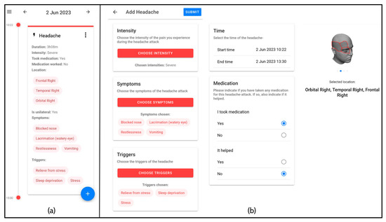 Headache registration interface for participants during the longitudinal phase of the study. (a) The overview of headache events registered in a timeline. (b) The headache registry module with different steps to be completed.