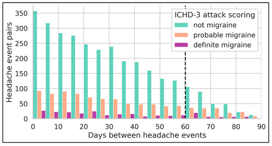 Overview of available headache event pairs per 5-day bin. The x-axis indicates the distance in days between the headache intervals of an event pair. Only events of the same participant with the same attack scoring can be paired. The vertical black dashed line indicates the upper headache-pair threshold.