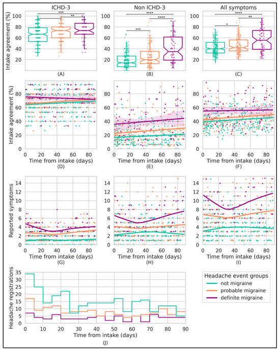 Headache event symptomatology agreement with clinician-led intake interviews and its trend over time. Each data point in the subplots corresponds to a bias-free headache event (n = 505), color-coded by the ICHD-3 headache event label. The subplots are divided into columns on the basis of the symptom subset, showing either agreement with the clinician-led intake interviews (Rows 1–2) or the number of checked symptoms (Row 3). Subplots (A–C) use box plots to depict the distribution of intake agreement for different subgroups, with statistical differences determined by the two-sided Mann–Whitney U test. Subplots (D–F) illustrate the trend of this intake agreement for the study period, with a first-order regression line and a 95% confidence interval for each headache event label group. The third row (subplots (G–I)), formatted similarly to the row above, displays the count of checked symptoms over time, but uses a locally weighted regression to emphasize local trends. Finally, the subplot (J) represents a histogram that counts the available headache events for each label group over time, using 5-day bins. Note: p-values: **** = p < 0.0001, *** = p < 0.001, ** = p < 0.01, * = p < 0.05. Abbreviations: ICHD-3, International Classification of Headache Disorders Third Edition; Q1, first quartile; Q3, third quartile.