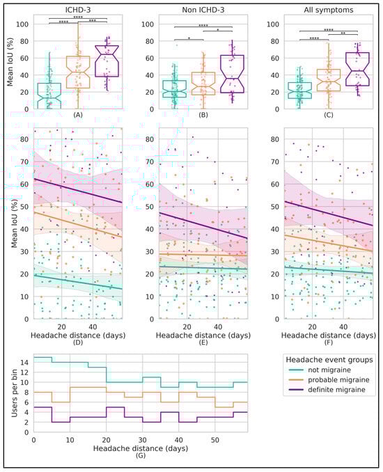 Per-participant mean IoU symptom similarity using paired headache event bins (bin size = 5 days). All subplots display median-aggregated IoU values of headache event pairs, using 5-day bins based on the headache distance of each pair. The headache event pairs were formed by combining headache events from each participant that have the same group label (i.e., “definite migraine”, “probable migraine”, or “not migraine”) and are color-coded accordingly. The columns of the first two subplot rows (subplots (A–F)) indicate the symptom sublists. In the first row (A–C), box plots illustrate the distribution of these per-participant mean-aggregated similarity values across different subgroups, with the two-sided Mann–Whitney U test indicating statistical differences. The second row (D–F) visualizes the similarity trend over time, represented by the distance of headache event pairs, featuring a first-order regression line and a 95% confidence interval for each classification group. The bottom subplot (G) is a histogram that counts the number of participants providing these mean aggregated values for each corresponding headache event label and 5-day bin. Note: p-values: **** = p < 0.0001, *** = p < 0.001, ** = p < 0.01, * = p < 0.05. Abbreviations: ICHD-3, International Classification of Headache Disorders, Third Edition; IoU, intersection over union.
