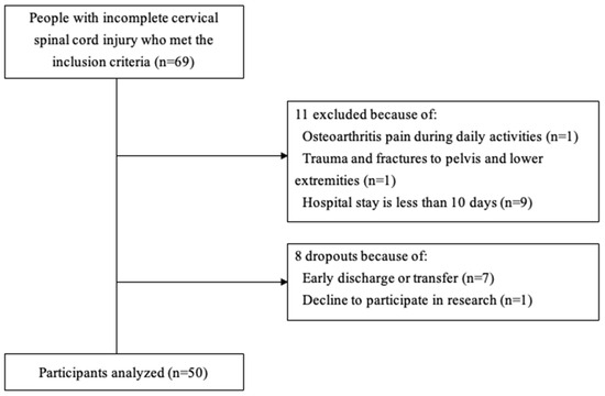 In this single-center prospective cohort study, the following enrollment criteria were applied: (1) people with traumatic iCSCI admitted to the Advanced Critical Care Center of the hospital from November 2022 to July 2024; (2) no psychiatric disorders or dementia that would affect their understanding of the examination procedures and instructions; (3) age between 20 and 90 years; and (4) ability to maintain the standing position without hand support or assistance for more than 30 s within 7 days of injury. The exclusion criteria were as follows: (1) motor dysfunction due to cerebrovascular disease or incurable neurological disease; (2) trauma or fracture of the pelvis or lower extremities; (3) hospitalization for less than 10 days; and (4) pain due to osteoarthritis of the hip or knee during activities of daily living (ADL). These criteria were assessed based on a review of medical records. The presence and type of pain before iCSCI were evaluated during medical interviews.