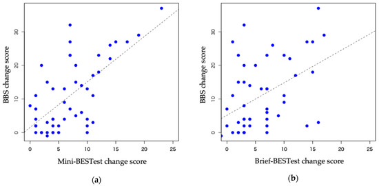 Correlations between the BBS change scores with Mini-BESTest and Brief-BESTest change scores. (a) Mini-BESTest (ρ = 0.57, 95% CI: 0.47–0.80); (b) Brief-BESTest (ρ = 0.42, 95% CI: 0.19–0.65). BBS: Berg Balance Scale; BESTest: Balance Evaluation System Test; CI: confidence interval.