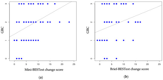 The correlation between GRC and changes in test scores was moderately significant for the Mini-BESTest (ρ = 0.48, p < 0.05) and weak but significant for the Brief-BESTest (ρ = 0.35, p < 0.05) (Figure 3). GRC was the anchor in both tests because the correlation coefficient was >0.3.