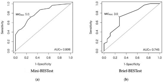 ROC curves for the change in the Mini-BESTest and Brief-BESTest scores based on the GRC. (a) ROC curve for the Mini-BESTest (MICROC = 5.0, AUC: 0.81, 95% CI: 0.69–0.93); (b) ROC curve for the Brief-BESTest (MICROC = 3.0, AUC: 0.75, 95% CI: 0.60–0.89). AUC: Area under the curve; BESTest: Balance Evaluation System Test; CI: confidence interval; MIC: minimal important change; ROC: receiver operating characteristic.