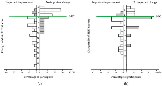 Distribution of Mini-BESTest and Brief-BESTest change scores (percentages) for the improved and unimproved groups: (a) Mini-BESTest; (b) Brief-BESTest. The left and right sides of the figure show the distribution of change in each balance assessment for improved and unimproved balances, respectively. The MIC values in the figure indicate MICadjusted, rounded to the nearest whole number for clinical relevance (Mini-BESTest: 4, Brief-BESTest: 3). BESTest: Balance Evaluation System Test; MIC: minimal important change.