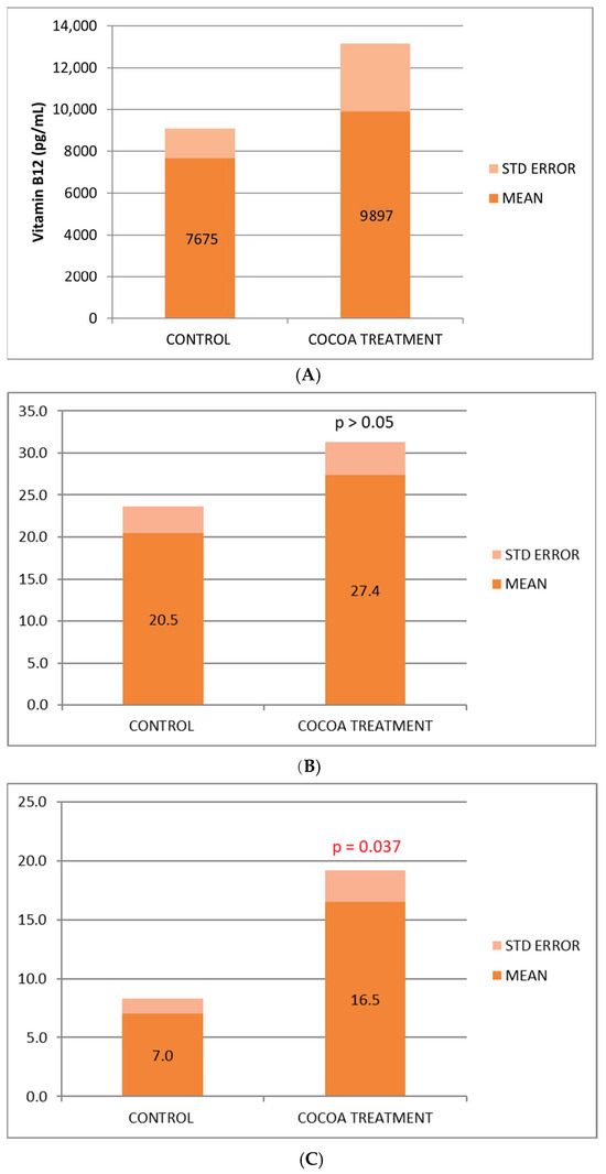 We observed a beneficial effect of the cocoa-derived compound added to the diet, which increases the serum concentration of the 3 vitamins (B6, B9, and B12) analyzed (Figure 1A–C), being statistically significant for vitamin B6, in the control of inflammatory process. The vitamin increase observed in the treated group could reflect in part the anti-inflammatory, nutritional, and immunological benefits associated with this bioproduct.