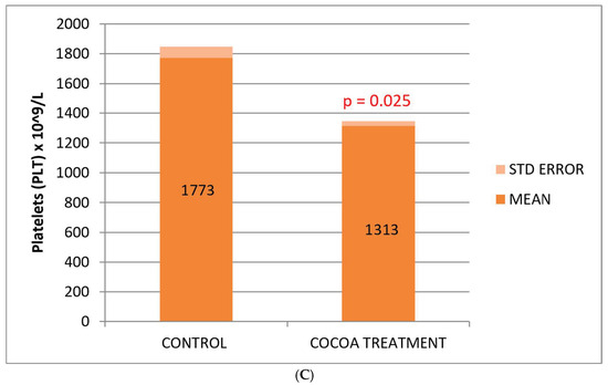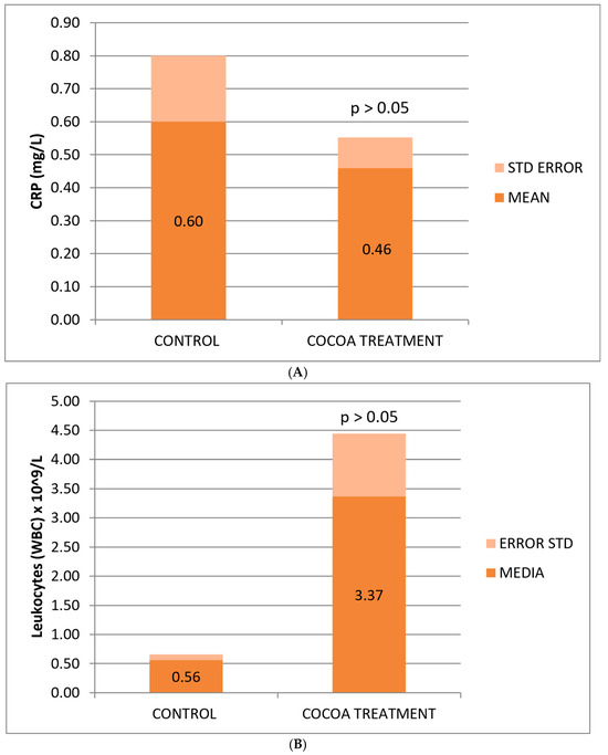 Biochemical and hematological values of CRP (A), leukocytes (B), and platelets (C) related to the anti-inflammatory response. Cocoa-enriched extract showed an increase in the leukocyte cell density, and slightly reduced the levels of platelets and CRP biomarker when ompared with control group.