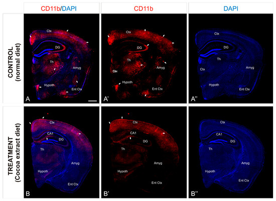 To investigate the preventive neuroinflammation effect of the cocoa-enriched extract diet on the current mice model, we performed an immunofluorescence staining analysis using antibody against CD11b as a key marker for inflammation (Figure 2). In mice brain, expression of CD11b in leukocytes increased significantly during the inflammation induction process (Figure 3A). In mice treated with the cocoa-enriched extract diet (Figure 3B), immunofluorescence expression pattern of CD11b was notably reduced and similar to healthy mice. However, untreated control mice brain showed that intermediate inflammation expression of CD11b was located in the entorhinal cortex and amygdala regions, while intense inflammation expression of CD11b was observed in frontal cortex layers, dentate gyrus, thalamus, and hypothalamus (Figure 3A,A’).