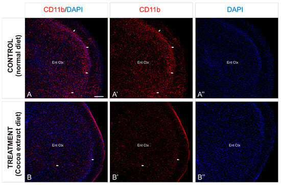 In order to observe the different inflammation patterns between the experimental mice groups, detail of the entorhinal cortex was analyzed (Figure 4) and the immunoreactivity against CD11b was analyzed. As described above, the entorhinal cortex of the non-treated mice showed an intense distribution of immunoreactive CD11b cells, mainly gathered in the outer layers of the cortex (Figure 4A,A’), although a profuse distribution of this marker was observed throughout the entire region. In contrast, the same cortical region of the treated mice showed a scarce presence of immunoreactivity against CD11b, with no particular cluster or accumulation site within the analyzed region (Figure 4B,B’).
