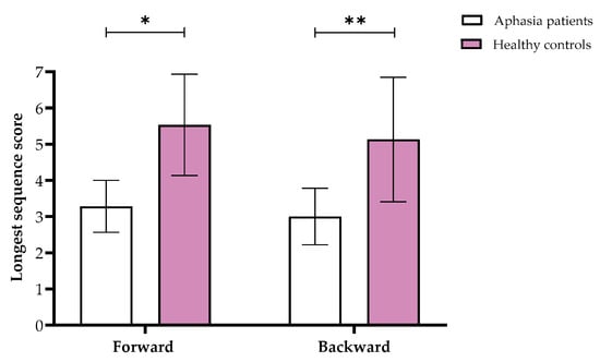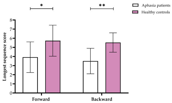 Means and standard deviations of the longest sequence scores for the Visuospatial Span forward and backward in the aphasia and healthy control groups. Note. * p < 0.05, ** p < 0.001.