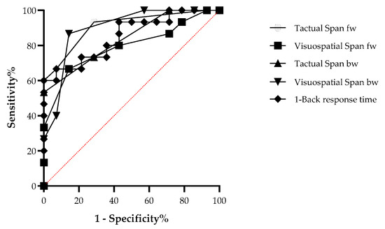 Finally, ROC analysis was employed to assess discrimination strength using sensitivity and specificity measures. The results indicated that all WM variables significantly distinguished the aphasia group from the control group (see Table 3). All tasks, including Tactual Span forward and backward, showed good discrimination between patients and controls (see Figure 3).