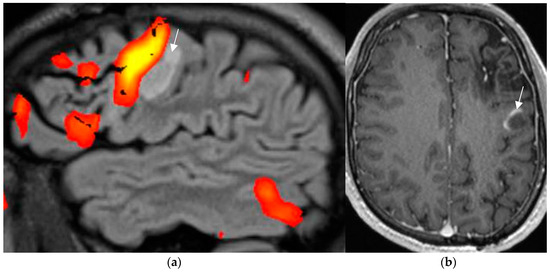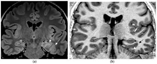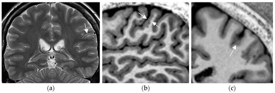 Cortical epileptogenic lesions are often subtle. Sequences that enhance gray–white matter contrast, such as the MP2RAGE sequence (see Figure 3b,c)—instead of the classical MPRAGE sequence—and the double inversion recovery sequence, have contributed to improved detection of the recently defined mild malformations of cortical development, of FCD, and of intracortical low-grade gliomas [76].