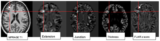 While visual analysis alone based on higher signal and spatial resolution increases the conspicuity of small pathologies, combination with postprocessing techniques (normalization, segmentation, and subtraction/division from a database of normal controls) and submission to a morphometric analysis program proved particularly beneficial to identify lesions that are beyond immediate visual recognition [78]. The morphometric maps created within the morphometry analysis program (Figure 6) encompass the MRI hallmarks of focal cortical dysplasia: abnormal extension of gray into white matter and configuration of deepened sulci, abnormal thickening of the cortical ribbon, and blurring of the gray–white matter junction. These are used to create morphometric extension, thickness, and junction maps. The “combined map” represents the maximum z score of the three maps for each voxel but is still finally verified by visual analysis [79].