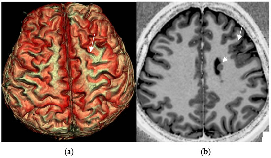 - Mellerio, C.; Roca, P.; Chassoux, F.; Daniere, F.; Cachia, A.; Lion St Naggara, O.; Devaux, B.; Meder, J.F.; Oppenheim, C. The Power Button Sign: A newly described central sulcal pattern on surface rendering MR Images of type 2 focal cortical dysplasia. Radiology 2015, 274, 500–507. [Google Scholar] [CrossRef] [PubMed]