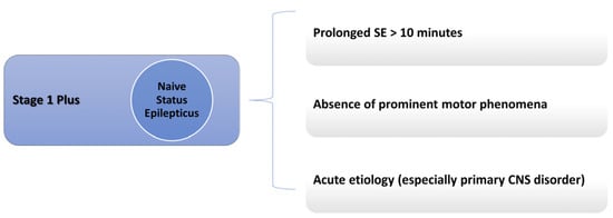 There are many conditions in which a lack of response to BDZ can be expected: these conditions have been grouped under the umbrella term of Stage 1 Plus in a previous publication by the author [22,23]. These include prolonged SE (a seizure lasting more than 10 min), acute etiologies (mainly primary central nervous system etiologies), and the absence of prominent motor phenomena [22]. However, this last case, such as in non-convulsive SE, might fall in the first category due to the delay in recognition and treatment. SE is considered BDZ-resistant before treatment if it meets at least one of the conditions of Stage 1 Plus. Figure 1 summarizes all Stage 1 Plus treatment-naïve SE cases.