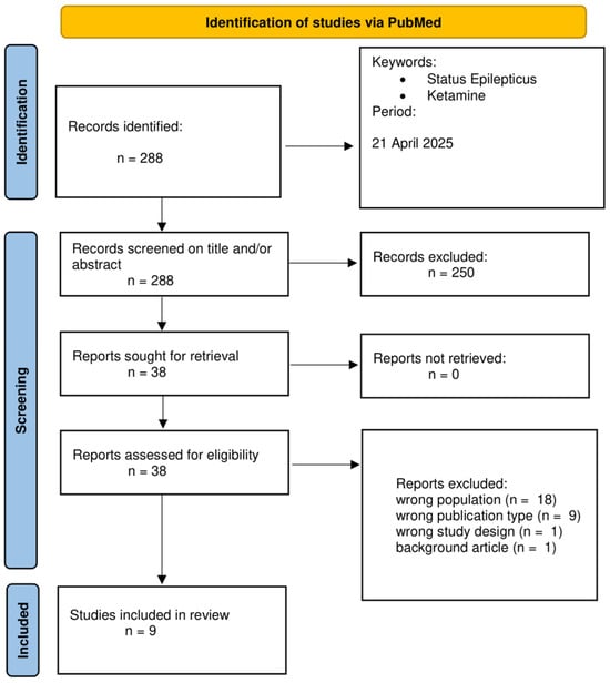 PubMed was searched with no restriction on time, including publications up to 21 April 2025. The search terms and the string used were as follows: “ketamine” AND “status epilepticus”. The research yielded 288 results. English language restriction was applied. Case reports and series with fewer than 25 patients, studies from pre-hospital settings, and super-refractory SE studies were excluded. This is due to many confounding factors and high variability of studies in out-of-hospital settings, which have substantial heterogeneity in protocols, delayed treatment documentation, and uncontrolled environments that limit interpretability. Studies on SRSE were also excluded, since Ketamine is already widely used and accepted in this context and its role is less debated. Moreover, in super-refractory cases in which Ketamine is used, many confounding factors intervene, such as numerous drugs being given before and during Ketamine infusion, making it harder to extrapolate Ketamine’s role. Consequently, only articles of Ketamine in early, established, and refractory SE were included in the analysis. Reviews and studies on animals were excluded from the primary analysis, and the output table summarizes all studies. The following variables were collected for each study: population, SE type, Ketamine timing, initial dose, infusion rate, response rate, adverse events, population group, median age, pre-existing epilepsy, and anti-seizure medication before Ketamine. Studies in which super-refractory SE and RSE patients were not differentiated were excluded and classified as having “wrong study design”. Pre-hospital works and small case series were excluded and classified as having “wrong population”. Reviews and meta-analyses were excluded and classified as being “wrong publication type”. A total of 9 articles are included in Table 1, which outlines all the most important and robust evidence from human studies about Ketamine in SE in earlier phases, such as early, established, and refractory SE. In Figure 2, the PRISMA flowchart summarizes the screening process.