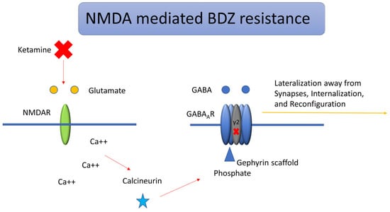 Lateralization and BDZ resistance of GABA-A receptors mediated by NMDA. During status epilepticus, activation of NMDA receptors modulates downstream kinase and phosphatase pathways that govern the trafficking of GABA-A, AMPA, and NMDA receptors. Calcium influx through NMDA or calcium-permeable AMPA receptors activates the phosphatase calcineurin, leading to the dephosphorylation of the gamma (γ2) subunit of postsynaptic GABA-A receptors. This modification reduces their affinity for the inhibitory scaffolding protein gephyrin, resulting in receptor dispersion from synapses toward endocytic sites, where the AP2 adaptor complex facilitates internalization via clathrin-mediated endocytosis. Ketamine exerts its action by blocking NMDA receptors and potentially reversing BDZ resistance.