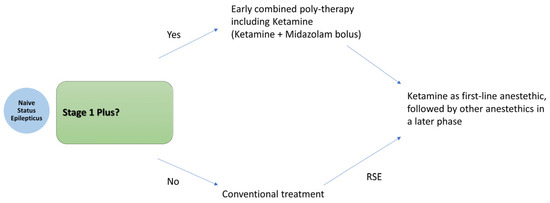 That is why the author previously proposed a definition of Stage 1 Plus to identify cases of naïve SE that might be unresponsive to BDZ and, therefore, require a different approach. Stage 1 Plus is a treatment-naïve SE stage associated with BDZ resistance, with prolonged seizure activity (≥10 min), acute etiologies, and prevalent non-motor phenomena [22,23]. These cases benefit from earlier NMDA receptor antagonists (such as Ketamine), possibly requiring a combined polytherapy approach. A combined approach, one that includes BDZ and NMDA receptors antagonists, cannot be abandoned for the time being for two reasons: we currently lack clinical trials evaluating early therapy in SE with NMDA receptors antagonists only, and NMDA receptors antagonism might help restore SE response to BDZ.