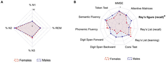 (A) Sleep profiles in female (red) and male (blue) patients. Values are expressed as percentages. (B) Neuropsychological profiles in female (red) and male (blue) patients. Values are expressed as z-scores, based on mean and standard deviation reported in normative studies for each test. Bold characters indicate statistically significant differences between cohorts: * p < 0.05.