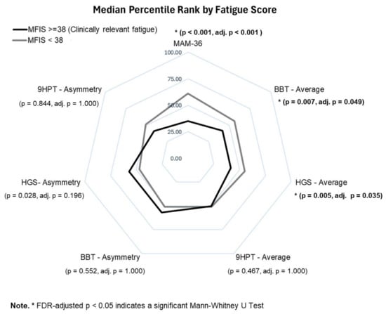 Participants with clinically significant fatigue (MFIS ≥ 38) reported lower perceived manual ability, with MAM-36 scores significantly lower than those without clinical fatigue (U = 4793.0, p < 0.001, adj p < 0.001). Regarding objective UL function, the group reporting clinically relevant fatigue showed significantly reduced performance on the BBT (U = 6599.5, p = 0.007, adj. p = 0.049), weaker HGS (U = 6546.0, p = 0.005, adj. p = 0.035), and greater asymmetry in HGS, although this group difference was no longer significant after FDR correction (U = 9530.5, p = 0.028, adj. p = 0.196). In contrast, no significant differences were observed for the 9HPT in terms of average performance or asymmetry, nor for asymmetry on the BBT. The radar chart in Figure 1 highlights the contrast in functional profiles between groups, illustrating more pronounced impairments in the fatigue group across both subjective and objective domains. The figure compares median percentile scores for each UL measure between participants reporting clinically relevant fatigue (MFIS ≥ 38) and those reporting lower levels of fatigue. Combined, these findings appear to suggest that fatigue is more closely related to deficits in strength and gross manual dexterity (as measured by HGS and BBT), rather than to fine motor control (as measured by 9HPT).
