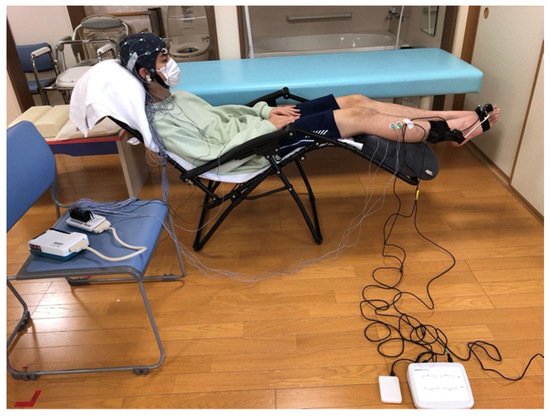 Experimental Setup. Active Ankle Dorsiflexion Task: Participants sat in a chair positioned to allow a clear view of their feet. During the task, a scalp electroencephalogram device and the articulation motion assessment system were carefully set up to prevent entanglement of wires. The angle of the reclining chair was standardized across all participants.